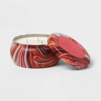 Lift your spirits with the refreshing, pleasant fragrance of the 12oz Marble Tin Candle Luminous Apricot Pink from Threshold™. This candle infuses your home with an apricot scent that creates an inviting ambience you’re sure to appreciate. While the gentle light flickers and sends shadows across the walls, the metal exterior add to the overall vibe. Easy to display on a mantel or a side table, this Threshold™ luminous tin candle is a must-have essential you’ll want to keep handy.