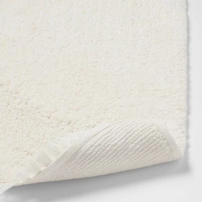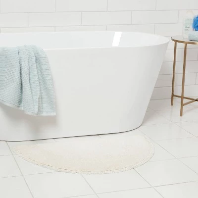 Bring plush comfort to your bath space with this Plush Half Moon Bath Rug from Threshold™. This cream bath rug easily coordinates with any bath decor. It features a unique half moon shape that’s decorated with tassel detailing for added charm. Made from tufted cotton-blend material, this machine made rug feels soft, cozy and comfortable underfoot. This low-pile bath rug is easily machine washable. Place it in front of your bathtub, shower or sink for functional style.