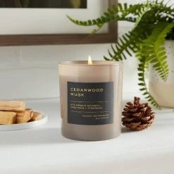 Illuminate your indoor space with the warm, refreshing aroma of this 8-Ounce Cedarwood Musk Lidded Glass Jar Candle from Threshold™. This scented candle comes in a black label glass jar with a shiny metallic lid that blends seamlessly with any decor. The pleasant aromas of cedarwood musk with notes of tonka bean and bergamot will bring you comfort when you need a well-deserved break, and the wick softly crackles as it glows, bringing a warm and cozy vibe that’s perfect for late evenings.