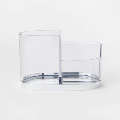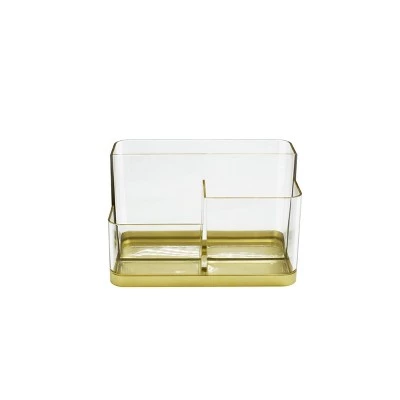 Keep your vanity tidy with the Vanity Organizer from Threshold™. This vanity organizer features one big compartment and two smaller compartments to accommodate all your makeup brushes, eyelash curlers, lip colors and other makeup accessories. Featuring a transparent design with a golden base, this minimalist vanity organizer brings modern and contemporary flair to your vanity.