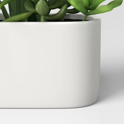 Infuse a gorgeous summery vibe into the aesthetic of your home decor with this Artificial Succulents in Long Pot from Threshold™. Featuring green artificial succulents arranged together potted in faux soil and placed inside a long ceramic pot, this faux plant lends a refreshing vibe to any corner of your room. Whether you place this artificial potted plant on an entryway table or on a shelf in your kitchen, it’s sure to add a welcoming vibe to your space year-round.