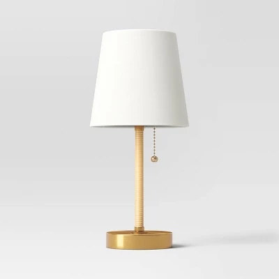 Bring style and warm lighting to any space in your home with this Mini Rattan Wrap Stick Table Lamp from Threshold™. This decorative table lamp features a metal stick wrapped in rattan for a neutral look that goes well with any decor scheme. The cotton drum shade completes the crisp, modern look, while the on/off light setting with a rotary socket switch allows for easy use. Place it on a side table next to your bed or in your entryway for an inviting glow.