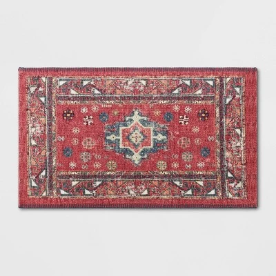 Add old-world artistry to your home with the Vintage Persian Printed Rug from Threshold™. This rug provides an effortless way to enhance the look of your empty floors while adding comfort and character to any room. Inspired by traditional Persian design, this woven rug sports a faded medallion motif at the center with floral accents, framed by a matching border to give this rug a sophisticated design. Easy to clean, this flat-pile rug is ideal for use in a variety of areas within your home, and it has a latex backing to help keep the rug in place.