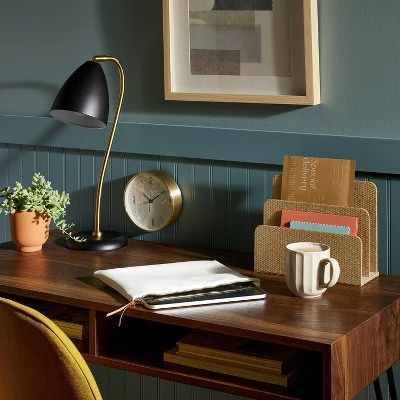 Keep clutter off your work desk with this Woven 2-Slot Letter Sorter from Threshold™. This letter organizer features two open slots to keep letters or paperwork organized yet easily accessible. Showcasing a woven design in a taupe hue with a brown faux-leather accent on the front, it’s sure to bring sleek style to your workstation.