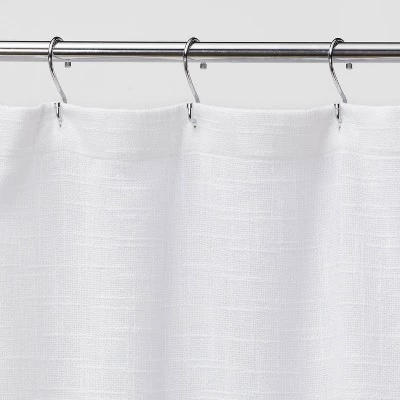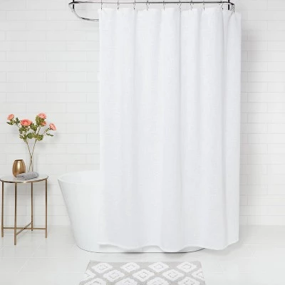 Update your bathroom aesthetic with a touch of simple style with this Woven Shower Curtain from Threshold™. Featuring a crisp and clean design, this white shower curtain keeps water off your bathroom floor while adding a touch of simplicity to your existing decor. With buttonholes along the top for easy hanging, this white woven shower curtain brings just the right amount of functional style to your bath space. We’re committed to making products better for you, and the world. This product is Standard 100 by OEKO-TEX certified, meaning that everything from the dyes and fabrics to accessories like buttons and zippers are tested and verified as free from harmful levels of more than 300 substances.